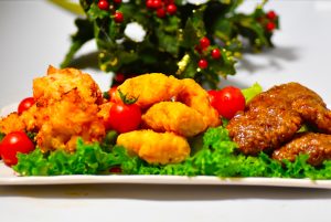 4.170度のこめ油で1.2.3.を揚げ、2.は揚げたてを煮詰めたCにからめる。レタス、ミニトマトとともに盛る。