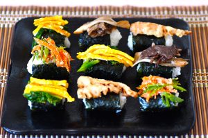 旬の菜の花はお浸しにし、こめ油で焼いた卵焼きとともにおにぎりにトッピング。