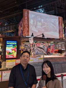 あす(28日)から、和歌山マリーナシティで開催の「大魚市(だいうおいち)」について、黒潮市場の岡本優作(おかもと・ゆうさく)さん(写真左)に、関陽菜子アナウンサーがインタビューしました!