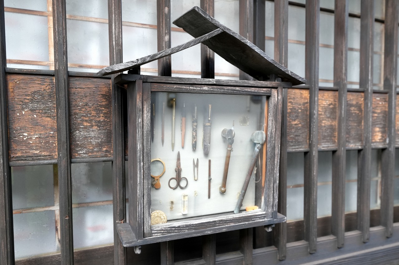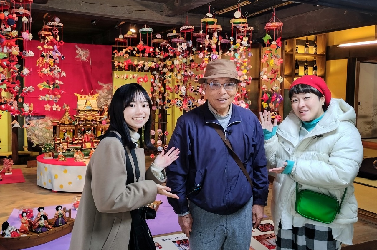 無料休憩所「立石(たていし)茶屋」へ。ここには、先月から吊るし飾りが常設展示されている。湯浅町では、これまでも春と秋に、ひな人形や吊るし飾りを展示し観光客を迎えていたが、一年中見られるところがあればと、始めたという。過去に、この地で開かれた醤油サミットを記念した展示もあった。立石茶屋の建物自体が国の登録有形文化財になっている。