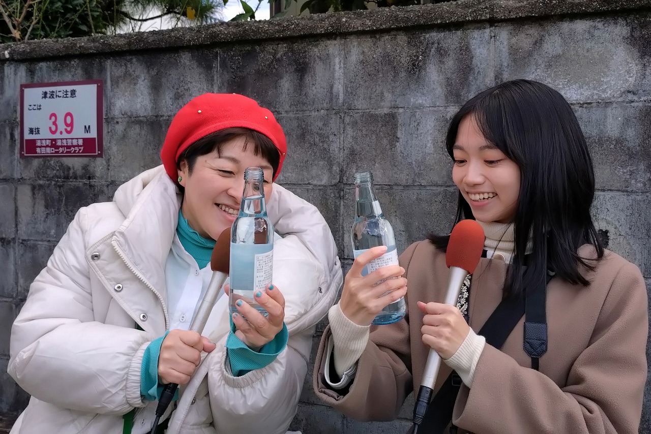 入ってすぐ、今月から販売が始まったばかりというサイダーに興味が湧いた女子2人。「湯浅のおいしい水でつくったサイダー」というらしい。340ミリリットル入り、1瓶300円(税込み)。今は、観光交流センターと町内の無料休憩所「立石茶屋」で販売され、今後は観光協会会員の店などに広げていきたいという話。詳しく取材してみた⇒和歌山放送ニュース