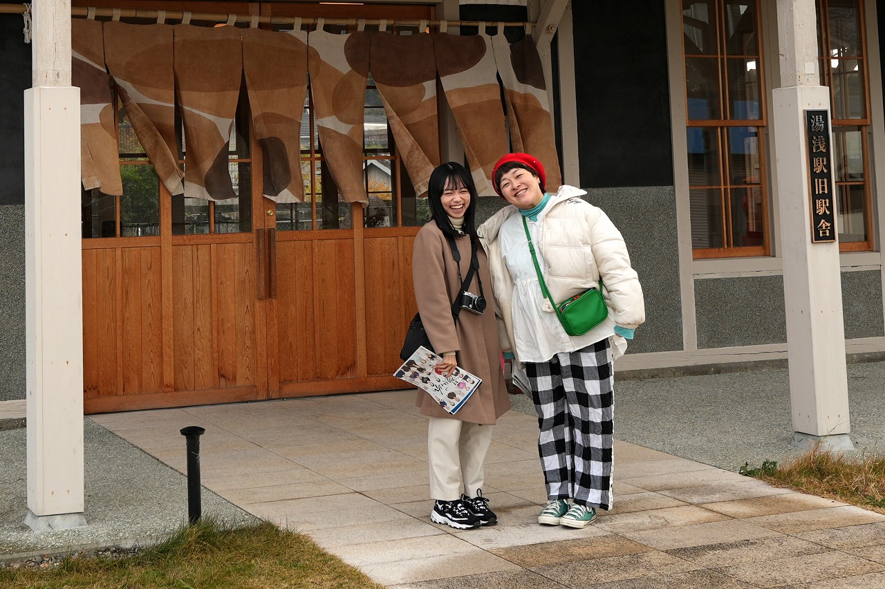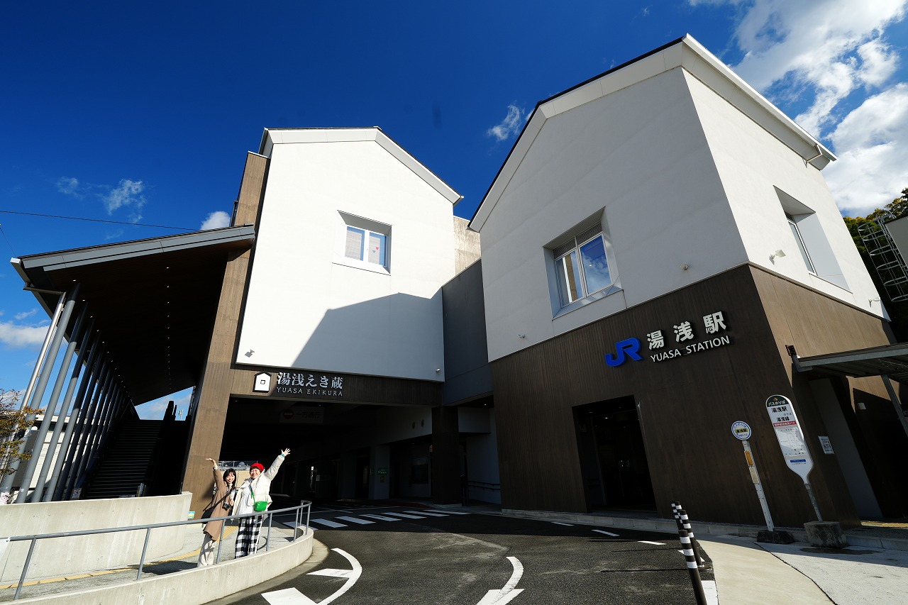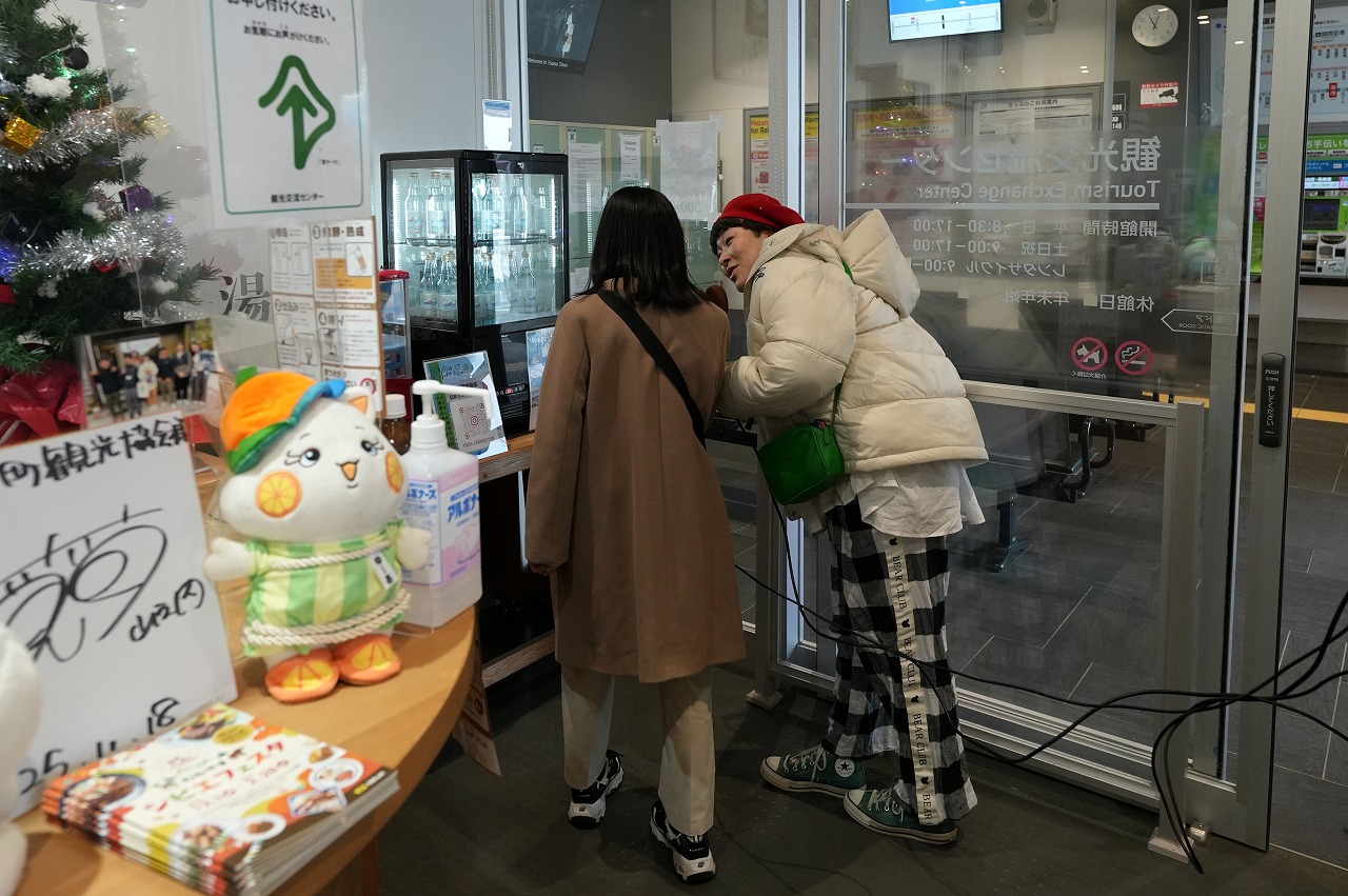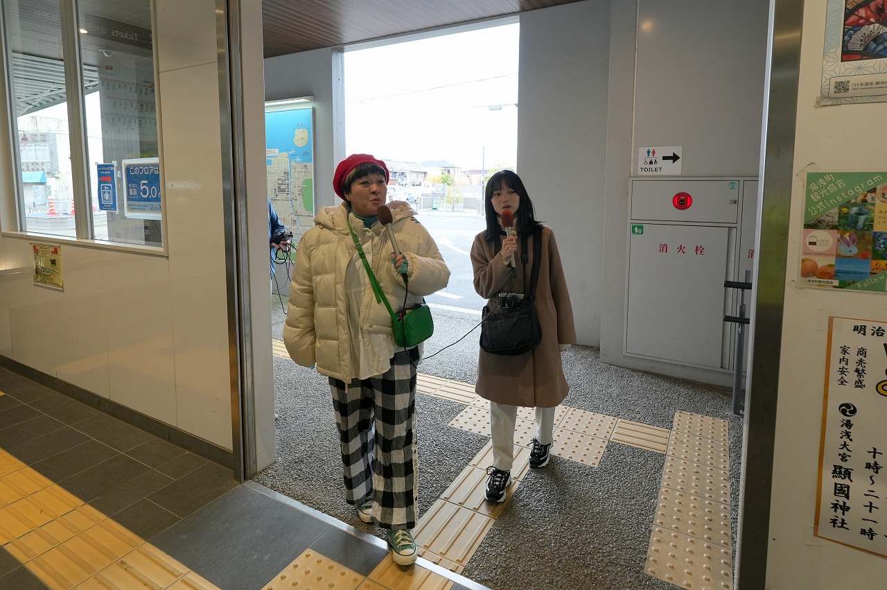 まずは、湯浅えき蔵1階、湯浅駅の改札の隣に位置する観光交流センターを訪ねた。改札側と車道側の2か所の入口がある。女子たちは、改札側から。