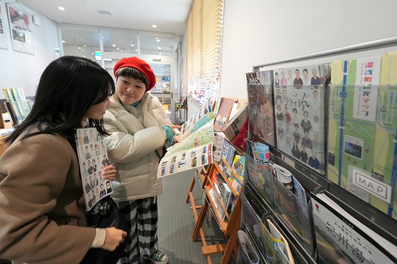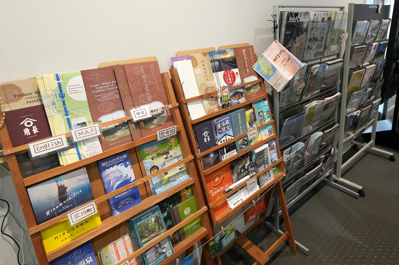 湯浅は観光ガイドの種類が多いことでも知られる。多言語化も図られている。そして、ここにはいろいろ揃っている。飲食ガイドに興味津々で手にする女子たち。