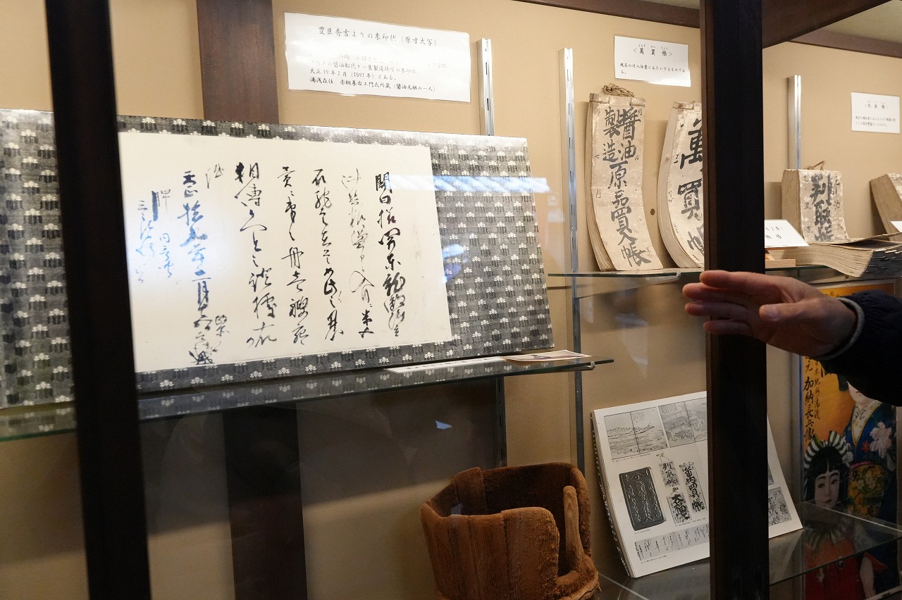 醤油づくりの道具を展示し無料公開している角長の醤油博物館に立ち寄った。ショーケースに秀吉からの書状があると教えられ、びっくり。