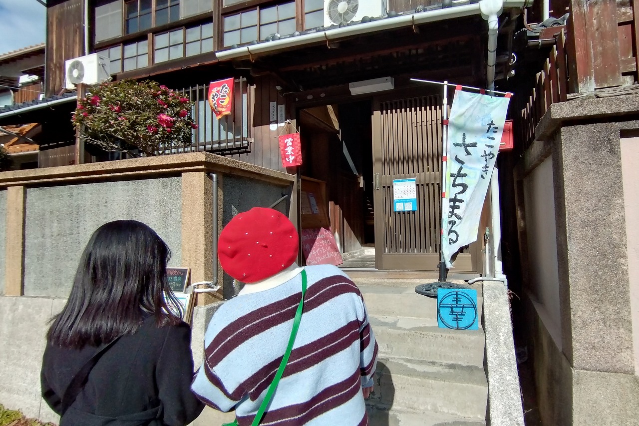 海岸沿いの通りから、1本中に入った路地を南に歩いて行く。「おもしろくて、おいしいお店があるから」と柳橋さんが案内する。路地は小さな川に突き当たった。堤川というらしい。川に沿って海の方に少し歩くと、たこ焼きという幟旗が揺れる大きな古民家が見えてきた。去年夏に開業したばかり、古民家リトリート「さちまる創舎(そうしゃ)」に到着した。