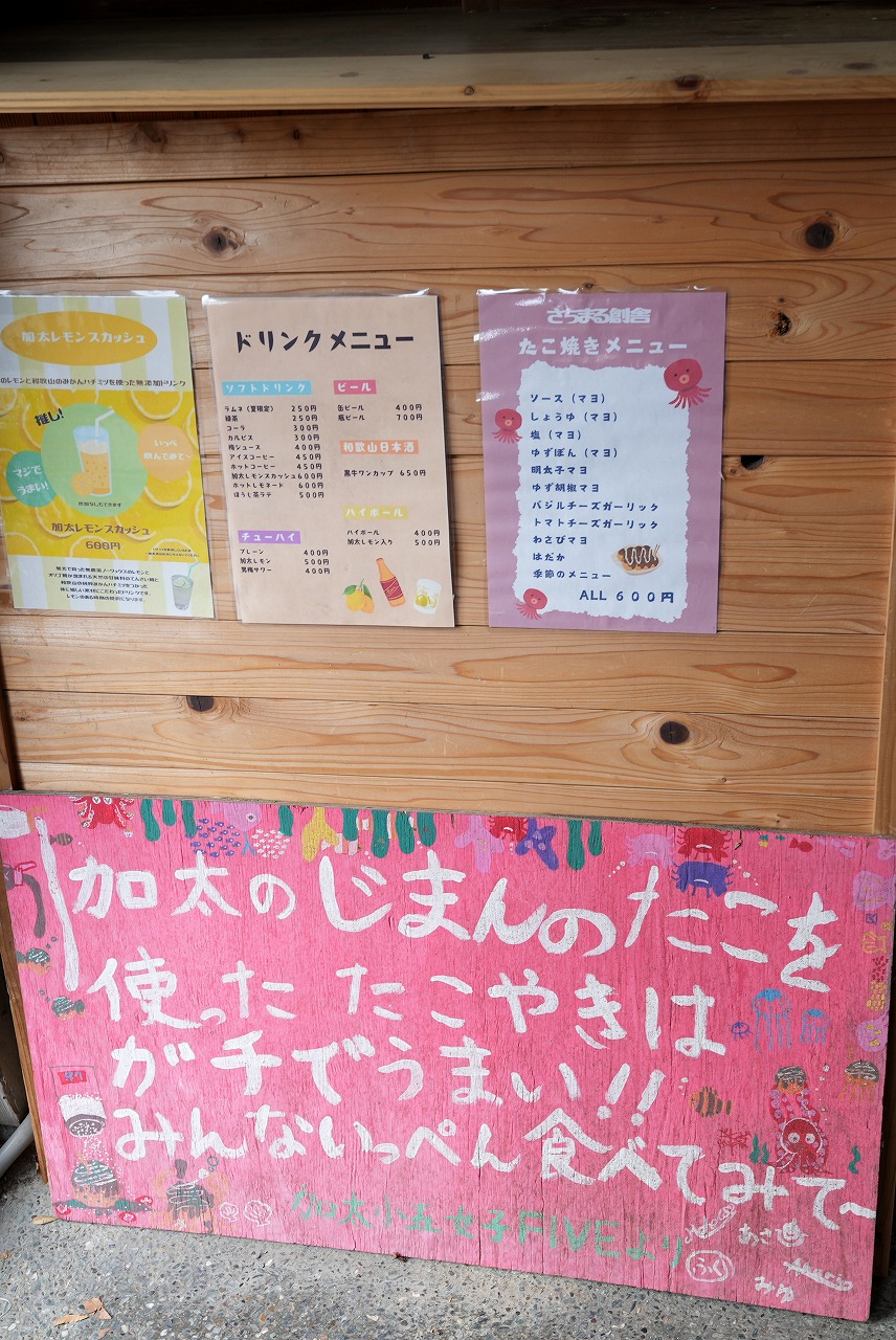 「加太の自慢のタコを使ったたこ焼きはガチでうまい」など、掲示がたくさんで情報が多い。おもしろそうではある。柳橋さんに続いて入っていくと、オーナーで、アーティストという佐竹幸(さたけ・さち)さんが迎えてくれた。地元の加太で、古民家リトリートを始めた経緯などを聞いた。ゆっくりできて、活力を充電できるんだとか。
