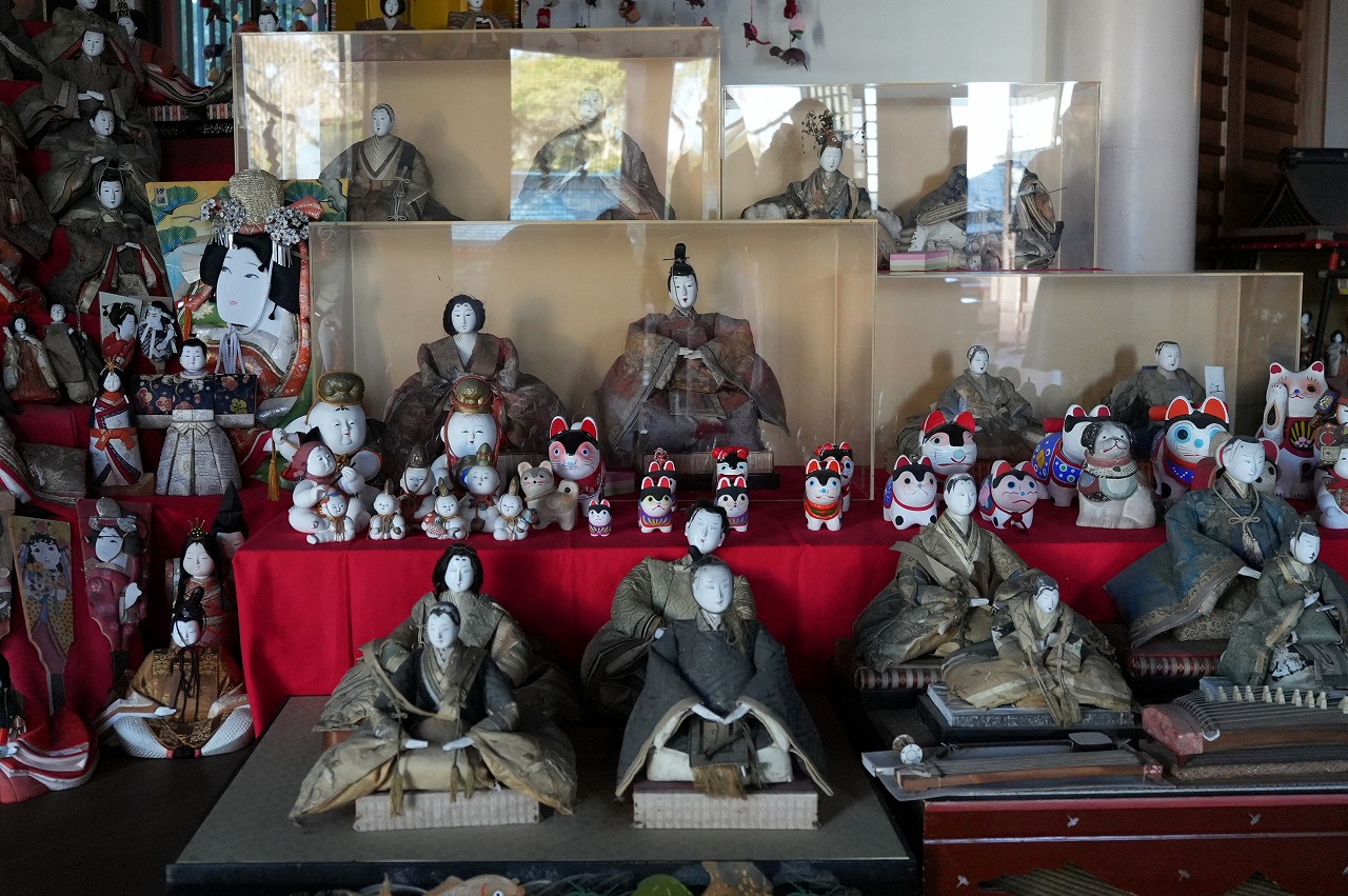 女子2人は参拝のあと、本殿や宝物殿を見せてもらう。この神社は、どこにも人形がたくさんある。本殿には、年代ものの人形が多く、宝物殿には、民俗資料的な展示物も多い。今回は特別に見せてもらったが、普段は開館していない。正月3が日、針供養の日、雛流しの日には開館するという。機会があれば見学してほしい。