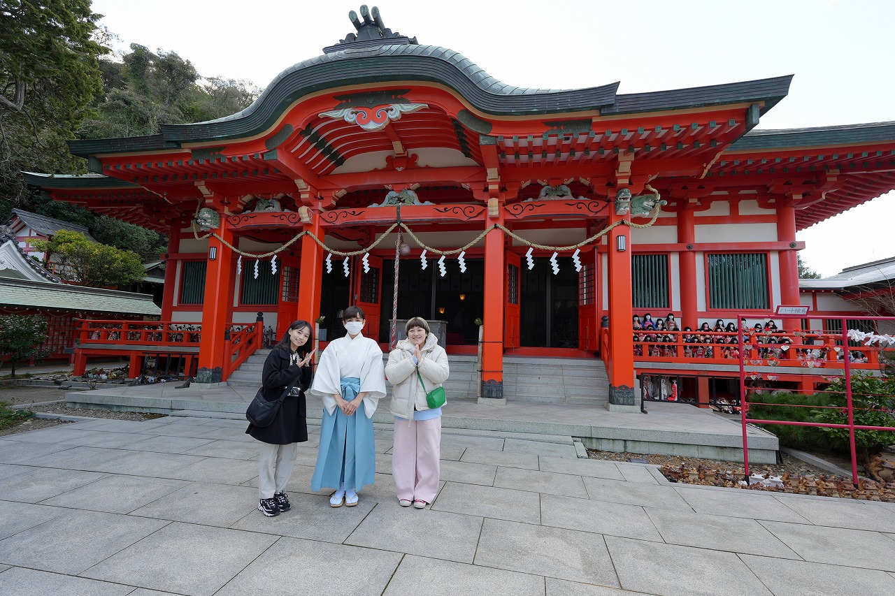 初詣を兼ねて、淡嶋神社へ。この番組では、2018年4月「GWにもオススメ、加太・友ヶ島旅(三浦ちあき&柳橋さやか)」や2022年4月「葛城修験と砲台跡と港町、加太を歩く旅(三浦ちあき&伊舞なおみ)」でも訪ねている。ただ、これらの回では基本的には参拝に立ち寄っただけ(柱の穴から抜けなくなりそうだった女子も1人いるが・・・)だったので、今回は、前田智子宮司に案内をお願いした。